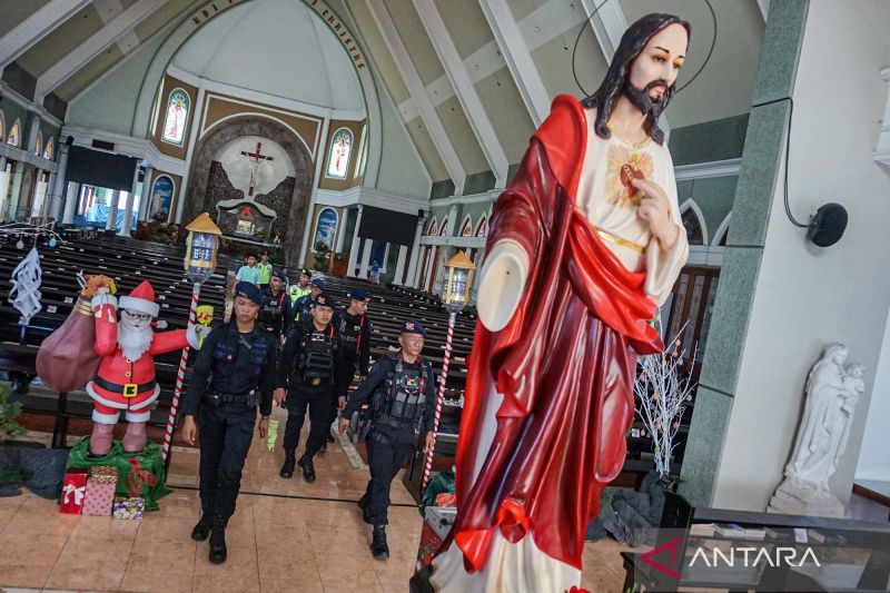 Personel Gegana Polda Jateng melalukan sterilisasi di Gereja Santo Petrus, Kota Pekalongan, Jawa Tengah, Rabu …