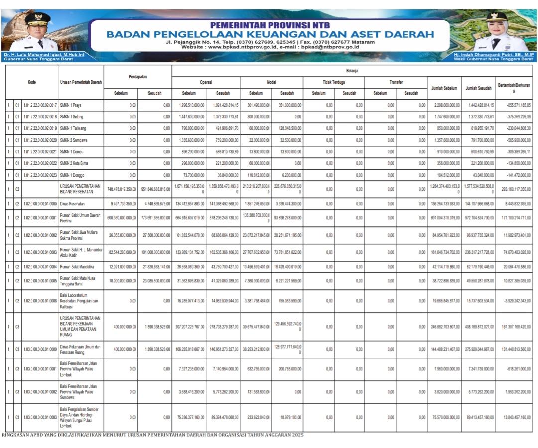 6 hours agoNovember 4, 2025by redaksilombokRINGKASAN APBD YANG DIKLASIFIKASIKAN MENURUT URUSAN PEMERINTAHAN DAERAH DAN ORGANISASI TAHUN ANGGARAN 2025redaksilombok-Adv #16Baca Juga : Piala Gubernur NTB 2022 Turnamen Bola Voli Pelajar NTBDon't MissRINGKASAN APBD YANG DIKLASIFIKASIKAN MENURUT URUSAN PEMERINTAHAN DAERAH DAN ORGANISASI TAHUN ANGGARAN 2025RINGKASAN APBD PERUBAHAN YANG DIKLASIFIKASI MENURUT KELOMPOK DAN JENIS PENDAPATAN, BELANJA, DAN PEMBIAYAAN TAHUN ANGGARAN 2025RINGKASAN APBD PERUBAHAN YANG DIKLASIFIKASI MENURUT KELOMPOK DAN JENIS PENDAPATAN, BELANJA, DAN PEMBIAYAAN TAHUN ANGGARAN 2025LAPORAN ARUS KAS UNTUK TAHUN YANG BERAKHIR SAMPAI DENGAN 31 DESEMBER 2024 DAN 2023