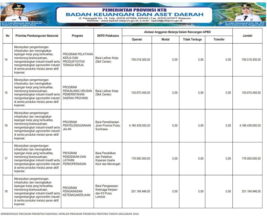 2 hours agoJanuary 23, 2026by redaksilombokSinkronisasi Program Prioritas Nasional Dengan Program Prioritas Provinsi Tahun Anggaran 2026redaksilombok-Adv #11Baca Juga : REKAPITULASI PERUBAHAN BELANJA DAERAH UNTUK KESELARASAN DAN KETERPADUAN URUSAN PEMERINTAHAN DAERAH DAN FUNGSI DALAM KERANGKA PENGELOLAAN KEUANGAN NEGARA TA 2021Don't MissSinkronisasi Program Prioritas Nasional Dengan Program Prioritas Provinsi Tahun Anggaran 2026Sinkronisasi Program Prioritas Nasional Dengan Program Prioritas Provinsi Tahun Anggaran 2026Ringkasan APBD Yang Diklasifikasi Menurut Kelompok Dan Jenis Pendapatan, Belanja, Dan Pembiayaan Tahun Anggaran 2026Ringkasan APBD Yang Diklasifikasi Menurut Kelompok Dan Jenis Pendapatan, Belanja, Dan Pembiayaan Tahun Anggaran 2026